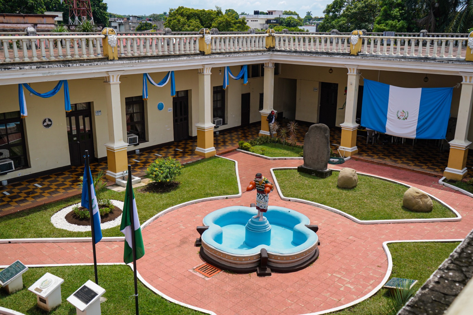 Retalhuleu, 05 septiembre del 2025. El histórico Palacio de Gobernación, ubicado en la zona 1 de Retalhuleu, luce en todo su esplendor adornado con banderas y decoraciones en azul y blanco, como parte de las actividades conmemorativas por los 204 años de independencia de Guatemala.